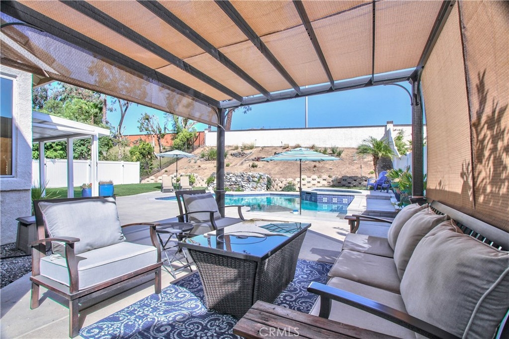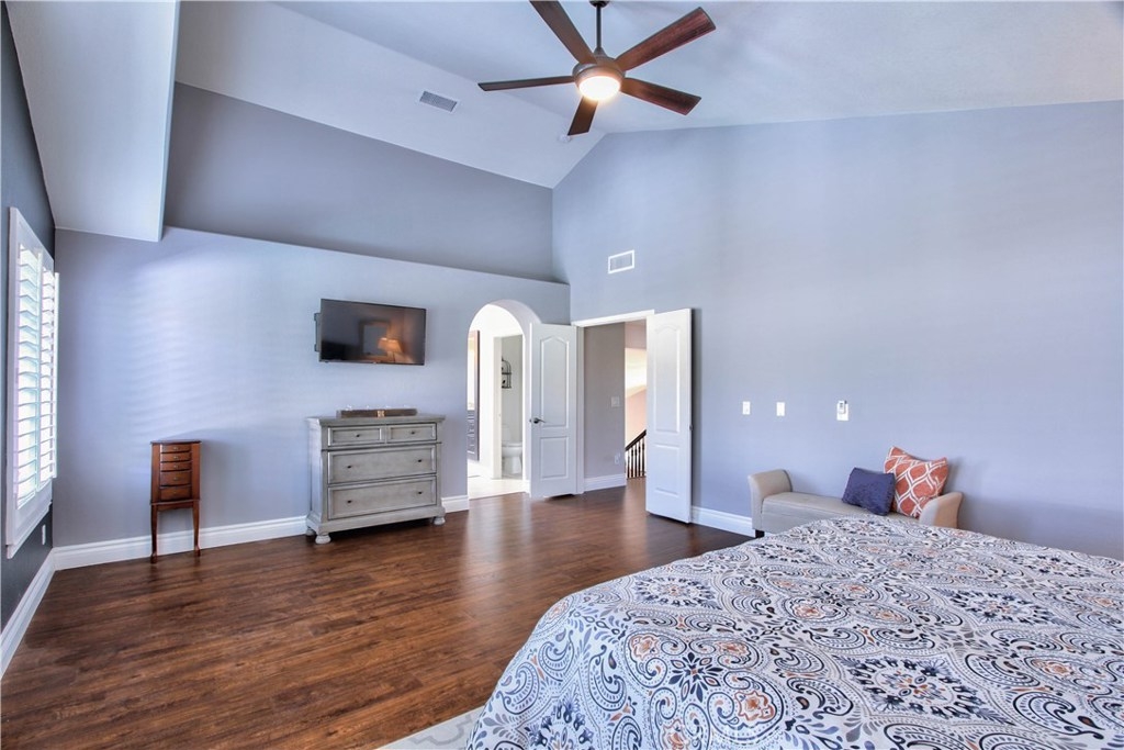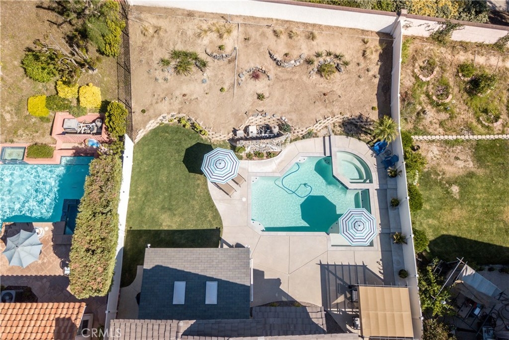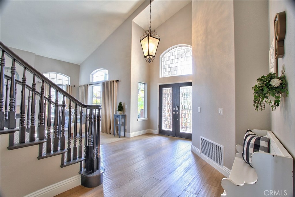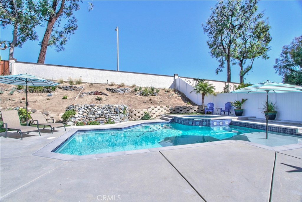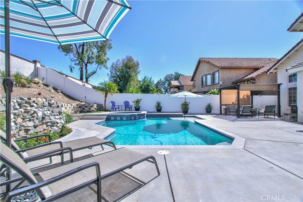 Welcome home to the highly sought-after community of Rancho Vista Estates in the heart of Temecula. Conveniently located near schools, shopping, restaurants, parks, wineries and more, this beautiful 5 bedroom, 3 bathroom home sits on a quiet double cul-de-sac and comes complete with a fully remodeled salt water pool and spa. Gorgeous inside and out, this home offers an attractive, on-trend paint palette throughout along with many upgrades. Your gated front porch leads you to the beautifully designed double-door entry where, upon entering, you are welcomed by an abundance of natural sunlight pouring in from the many windows and reflected in the two story ceilings. The kitchen is appointed with high end stainless steel appliances, a built in refrigerator and a huge center island featuring bar/counter seating – the envy of any chef! In addition to the spacious living areas, there is also a bedroom with a walk-in closet, an inside laundry room, and a full bath, all located downstairs. The 4 upstairs bedrooms include the master bedroom as well as an enormous guest room at the end of the hallway. All bedrooms have wood flooring (there is no carpet upstairs at all). The huge master bedroom and bathroom feature 2 closets, a large frame-less shower enclosure, a separate toilet room, and a dual basin vanity and large soaking tub with granite counters and surrounds. And this amazing rear yard was just made for entertaining. Too much to list! Come soon, this home will not last!